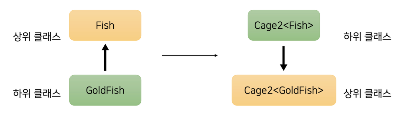 그냥 Fish 와 GoldFish 는 상속관계를 갖고 있지만, 해당 클래스들은 아무 관계도 아니기 때문에, 에러가 난다. 이것을 무공변, 불공변하다라고 한다. (Invariate)